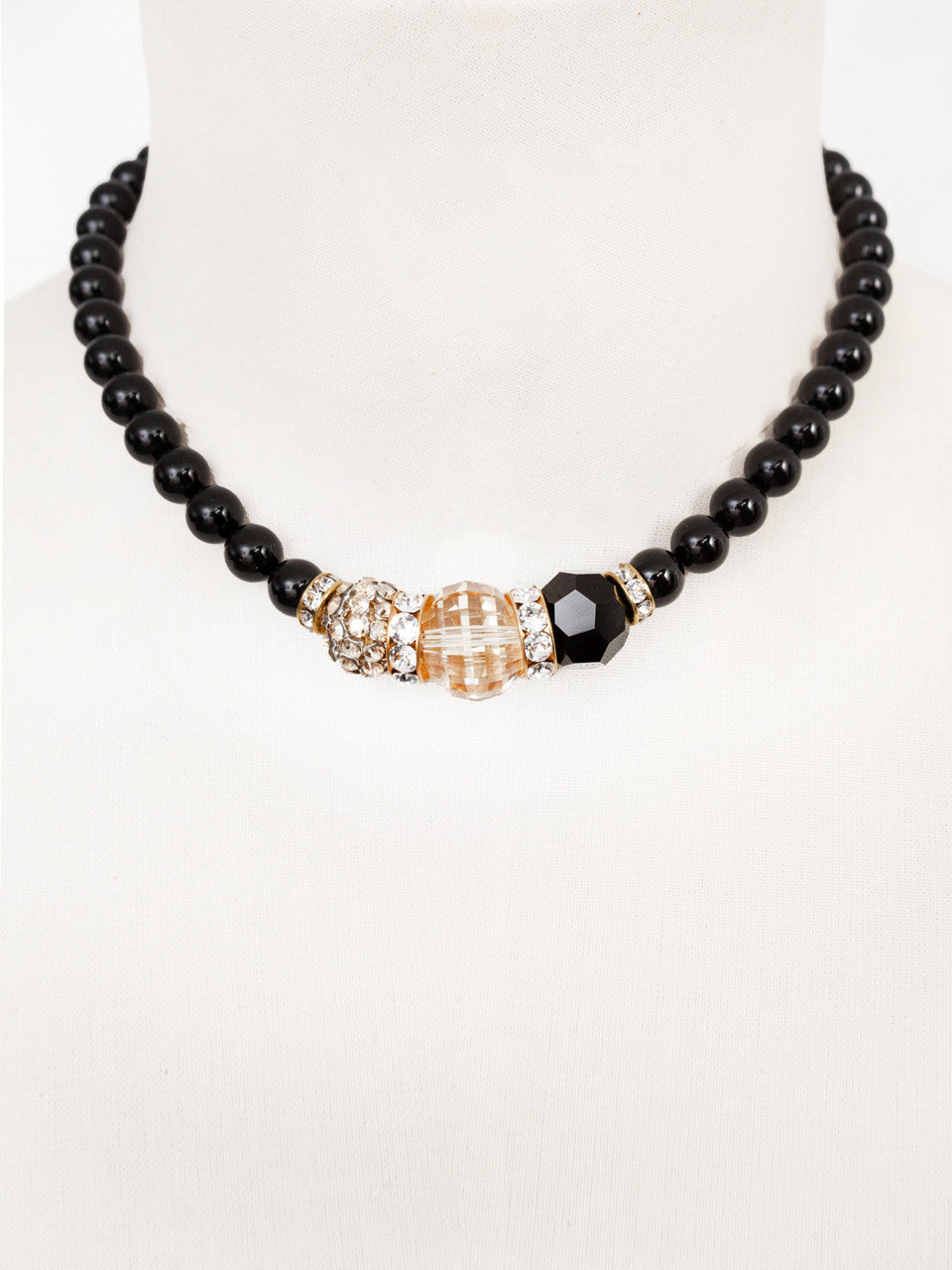 Black Swarovski Glass Beaded Necklace With Champagne Crystal Beads