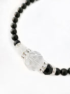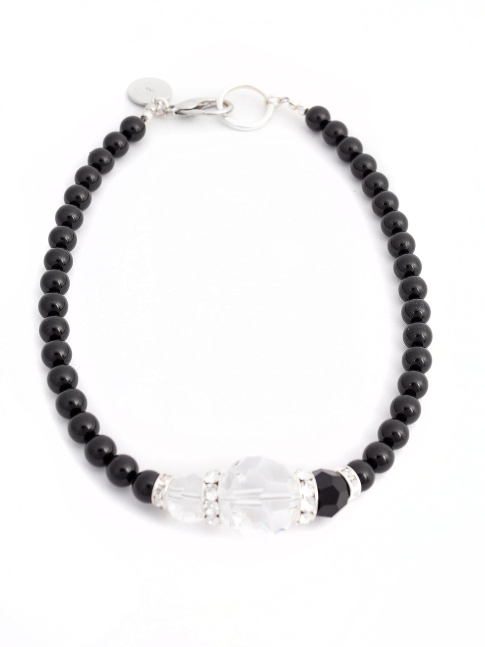 Black Swarovski crystal glass beads with Swarovski stoppers and clear color crystal beads, asymmetrical design with alternating beads in varying sizes and lobster claw fastening.