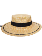 The boater hat featuring sand beige, straw, woven raffia design, a wide flat brim. The classic design is complete with a ribbon ties. One size. Outer: Straw 100%